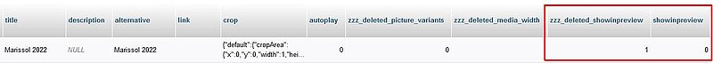 Es sind wieder alle Vorschaubilder vorhanden - jeder entsprechende Datensatz enthält eine "1", also die Variable für "In allen Ansichten anzeigen" (statt wie zuvor der "0" für "Nur in Detailansichten anzeigen"...