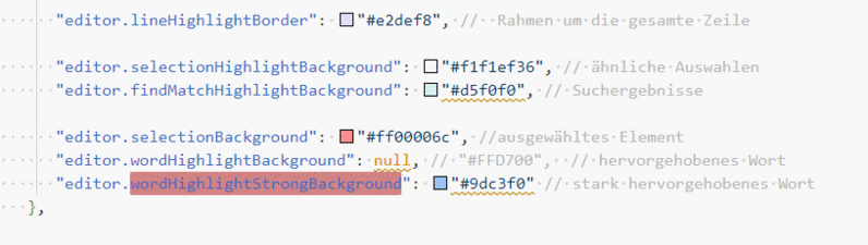 "editor.wordHighlightStrongBackground": "#9dc3f0" // stark hervorgehobenes Wort